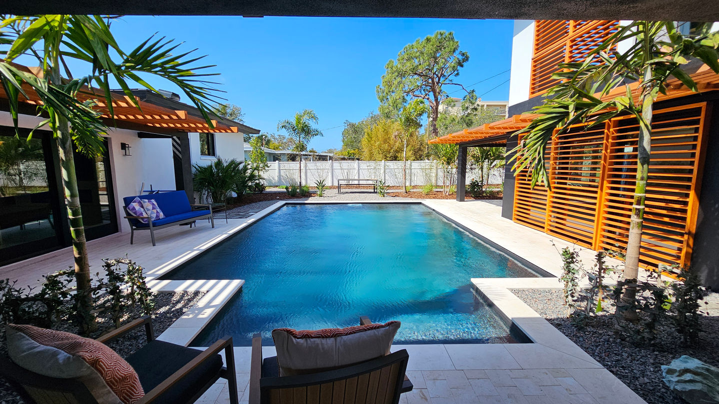 The Tropical Courtyard House transforms a once nondescript rambler into a lush, tropical retreat inspired by the principles of tropical modernism. Drawing inspiration from the likes of Vladimir Ossipoff and Geoffrey Bawa, this home embraces passive design strategies that invite light, shade, and natural breezes. The addition at the rear of the property is intentionally separated from the main residence, offering the owners a private retreat while allowing friends and family to enjoy the primary home. This separation not only creates a sanctuary-like courtyard at the center but also provides cooler, shaded areas that enhance the comfort of the outdoor space.